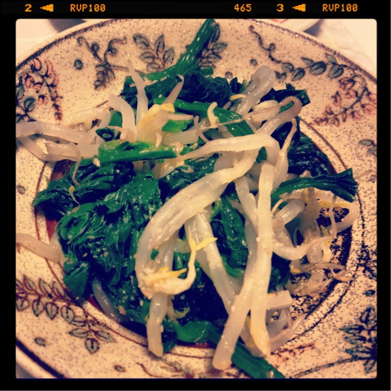 茹でたほうれん草ともやしをごま油(大さじ1弱)と白ごま(好きなだけ)、