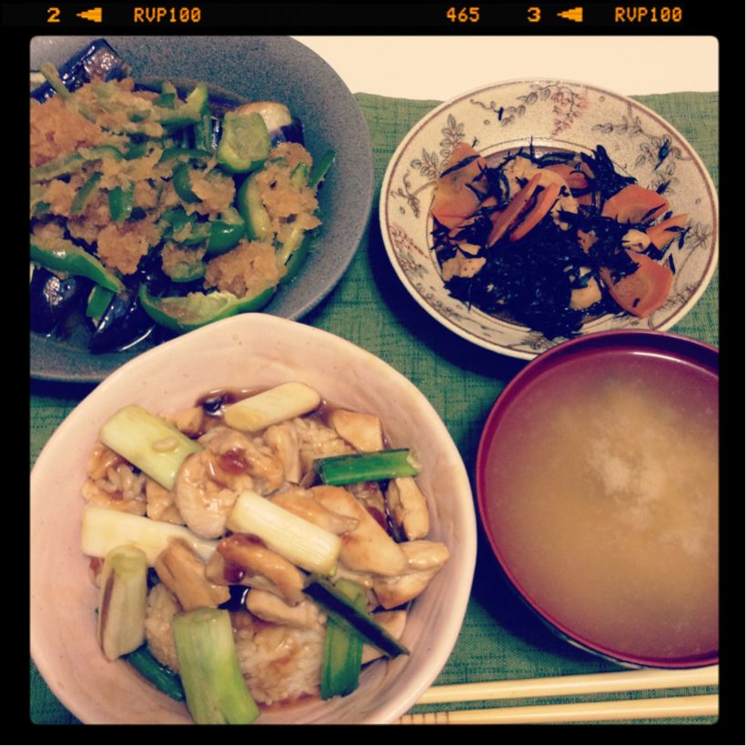 焼き鳥丼、茄子のみぞれ煮、ひじきの煮物☆