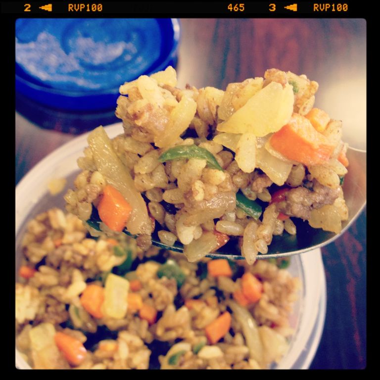 そのフライパンの熱だけで溶けたカレールーで炒飯を作ると、なんちゃってドライカレー弁当の完成!