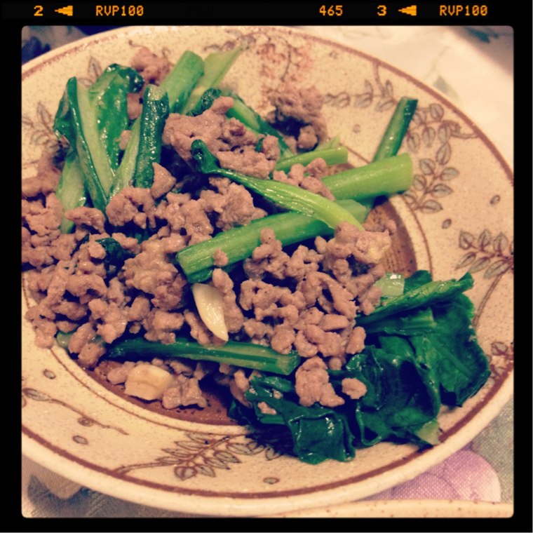 こちらは小松菜の挽肉炒め。
