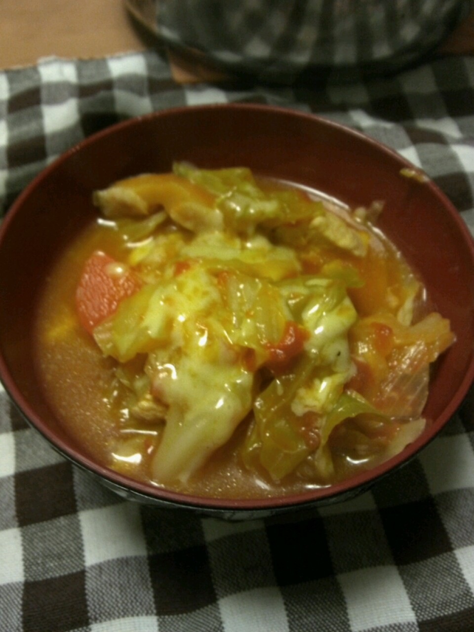 嫁さん作なので、詳しいレシピはわかりませんが、潰したホールトマト缶にコンソメベースのスープ。人参、キャベツ、きのこ、鶏肉、チーズなどが入っている様子!