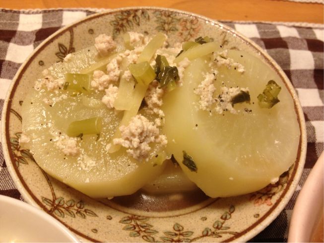 今日の晩飯は卵雑炊、大根の煮物、酸辣湯(サンラータンスープ)です。