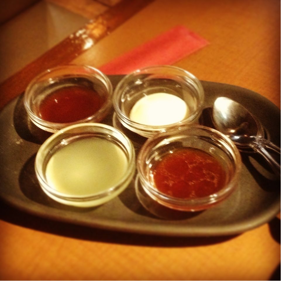 (左上から、源たれ、アリオリソース、レモン汁、野菜ソース)