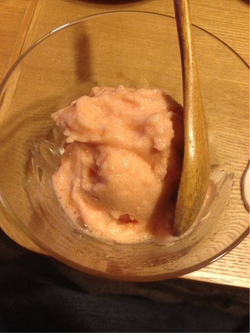 トマトを冷凍して、ヘタを取り、皮を剥き、メープルシロップと一緒にフードプロセッサーで