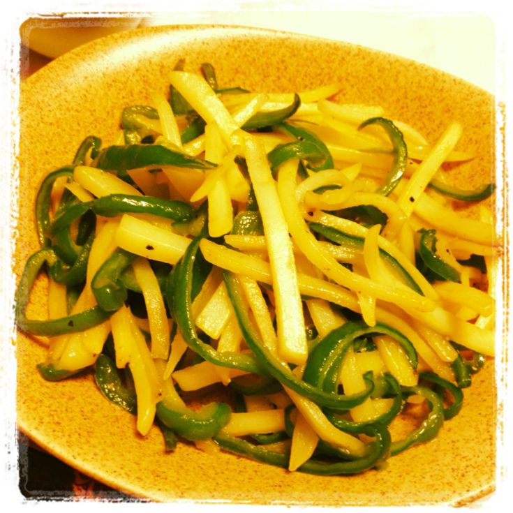 #1) じゃがいもは皮を剥き、千切りにして水にさらし、ピーマンは種を取り同じように千切りにします。