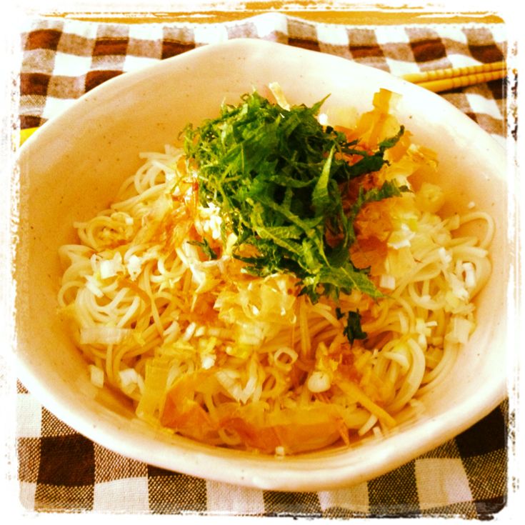 #3) ミョウガを千切りに、長ネギはみじん切りにし、素麺の上に盛り付けます。