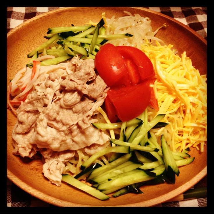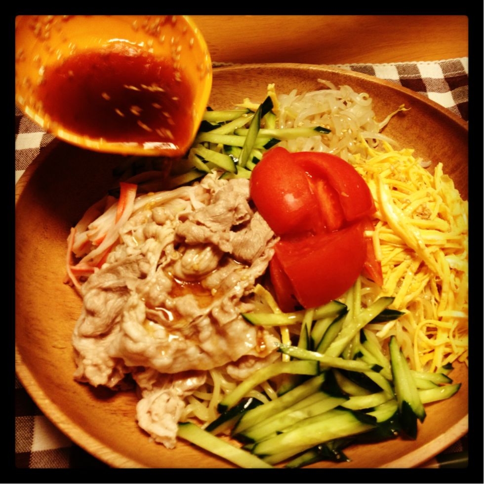 錦糸卵、きゅうり、もやし、トマト、カニカマ、豚細切れ(冷しゃぶ風)を入れてみました(^○^)